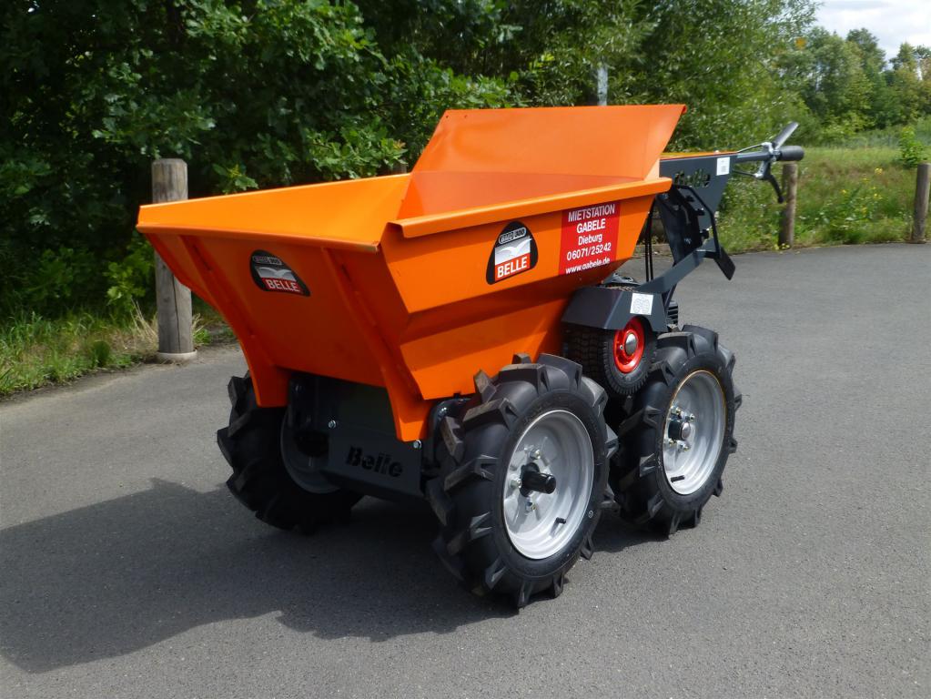 Der Handgeführte, motorisierte Minidumper verfügt über Allradantrieb und ist ausgelegt für die Verladung und den Transport bewegter Lasten bei allen Geländeverhältnissen. Er ist leicht bedienbar, hat eine hohe Steigfähigkeit und eignet sich für die unterschiedlichsten Verwendungen auf dem Bau sowie beim Landschaftsbau und in der Landwirtschaft. Er braucht wenig Platz, die Abmessungen erlauben durchfahren schmaler Eingänge (75 cm) und den Einsatz bei beengten Platzverhältnissen. Als Pritschenwagen (Flachbett) ist er nutzbar zum Transport für Verbundsteine, Zementsäcke, Rollrasen, Platten oder Palisaden.